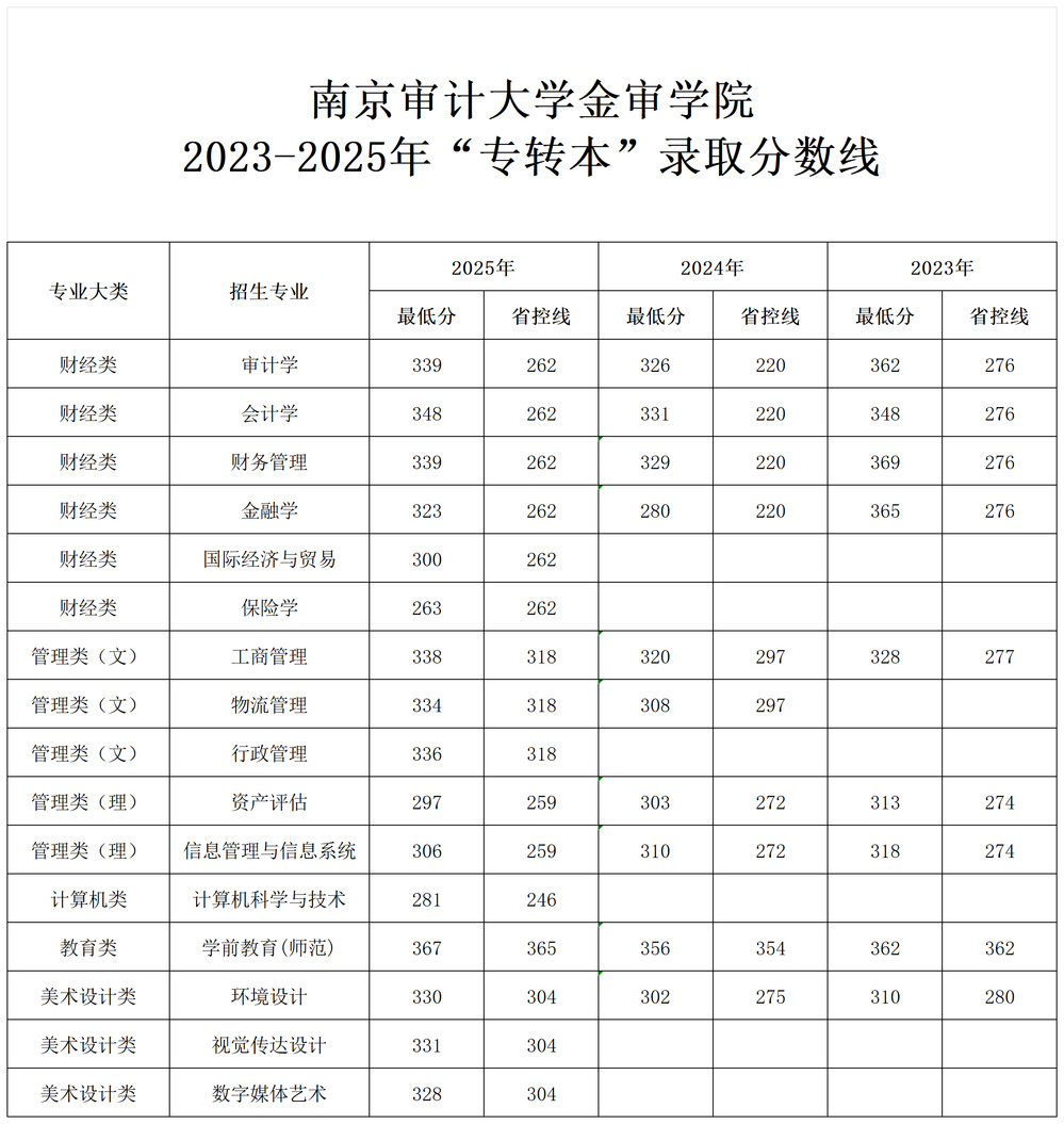 南京审计大学金审学院 2023-2025年“专转本”录取分数线