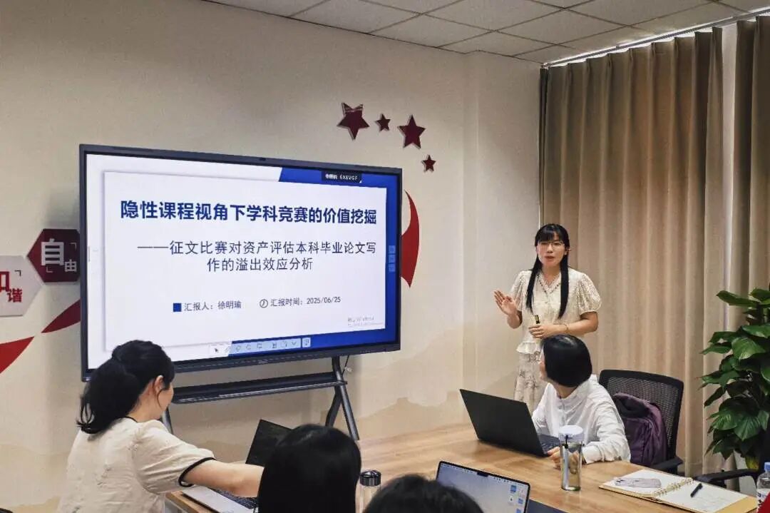 学科竞赛是“产教研融合”最生动的演练场。我指导学生参加中国资产评估教育论坛征文比赛,题目往往直接来自我的在研课题或行业前沿热点。学生在研究过程中,需要查阅大量最新文献、搜集整理相关数据并进行数据分析、完成模型构建并将模型应用于具体实际问题的解决中。在中国资产评估教育论坛获得的每一项荣誉,都是师生基于行业现实需求共同努力的成果。在参与征文比赛过程中,极大地锤炼了学生的文字表达与撰写能力、创新思维和研究能力,实现了“以赛促学、以研促教”。