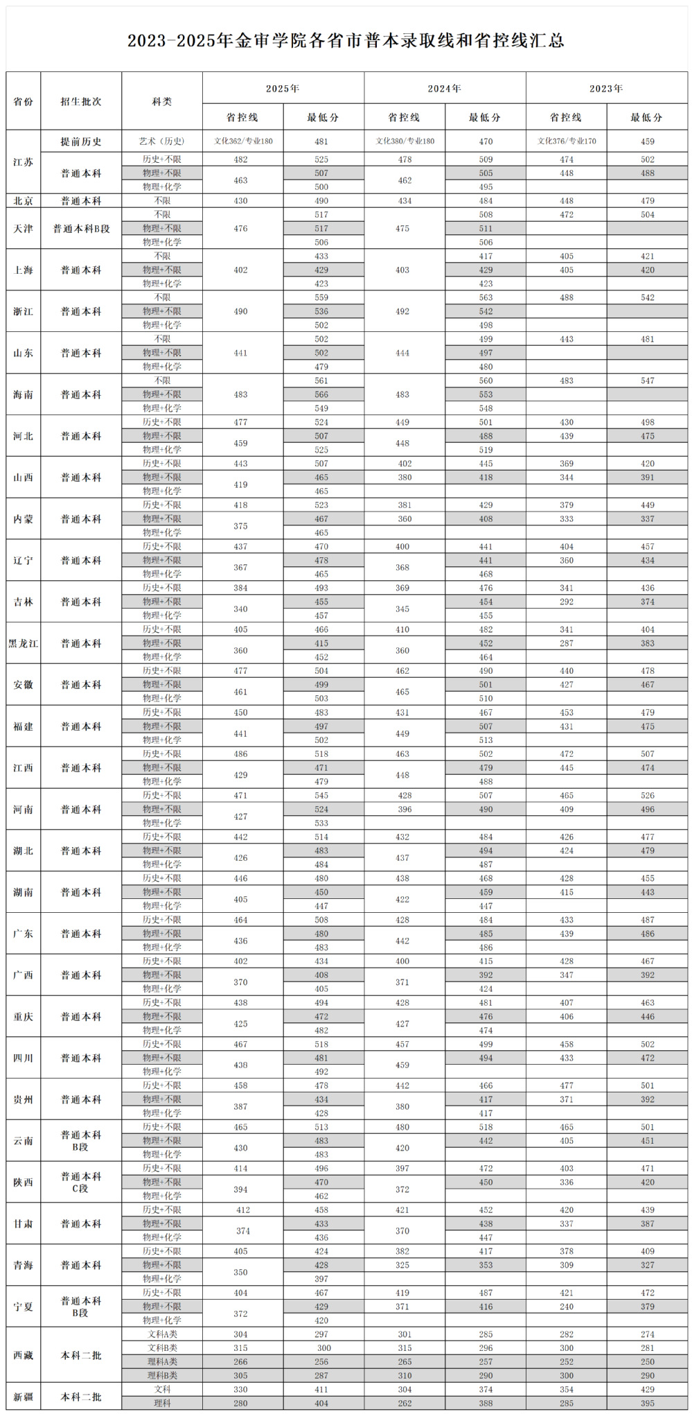 2023-2025年金审学院各省市普本录取线和省控线汇总